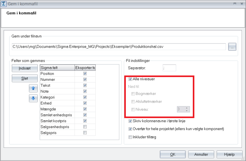 Under punktet Avanceret er det muligt at vælge indstillinger for, samt felter der ønskes at eksporteres i ens kommafil.
