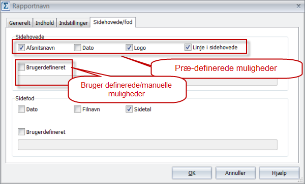 Header og footer kan sættes op på to måder, enten ved at bruge predefinerede muligheder, eller skrive en manuel opsætning: