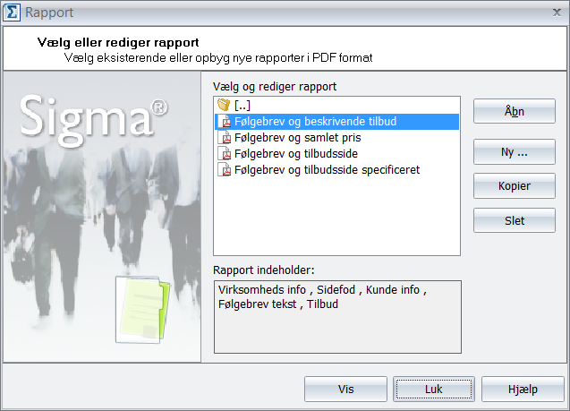 Sigma har et meget stærkt rapporteringsmodul. Formålet med rapporter er at lave f.eks. tilbudslister, materialelister, kalkulationsrapporter mv. Resultatet er en PDF fil, der direkte kan udskrives til printer, sendes med e-mail eller gemmes på computeren som dokumentation.